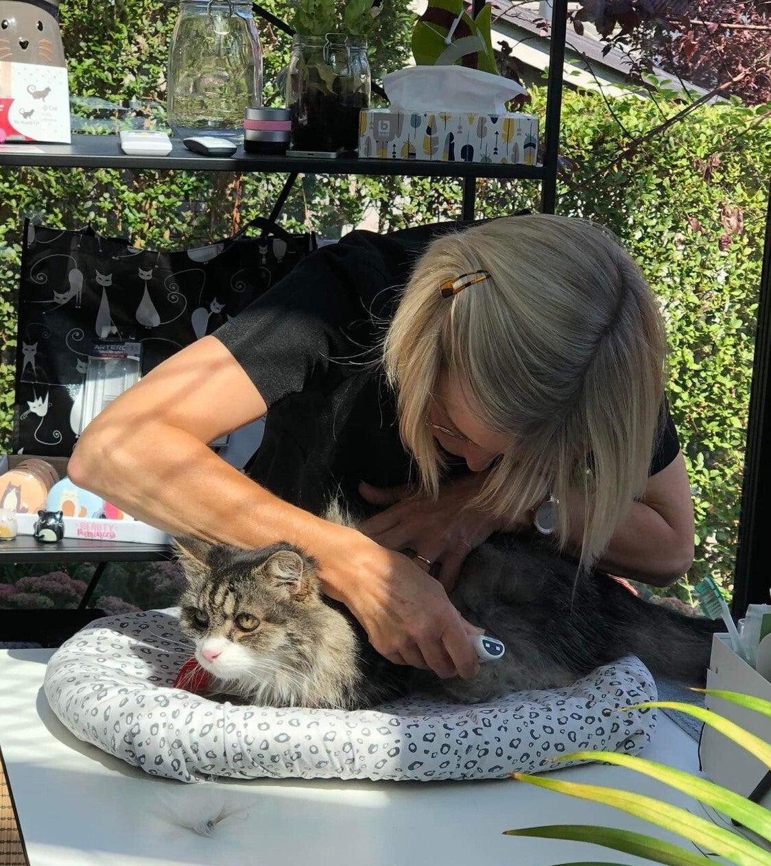 Nadine is een heel professionele kattentrimster ,onze geadopteerde Trixie was er erg aan toe, vol klitten heel erg.